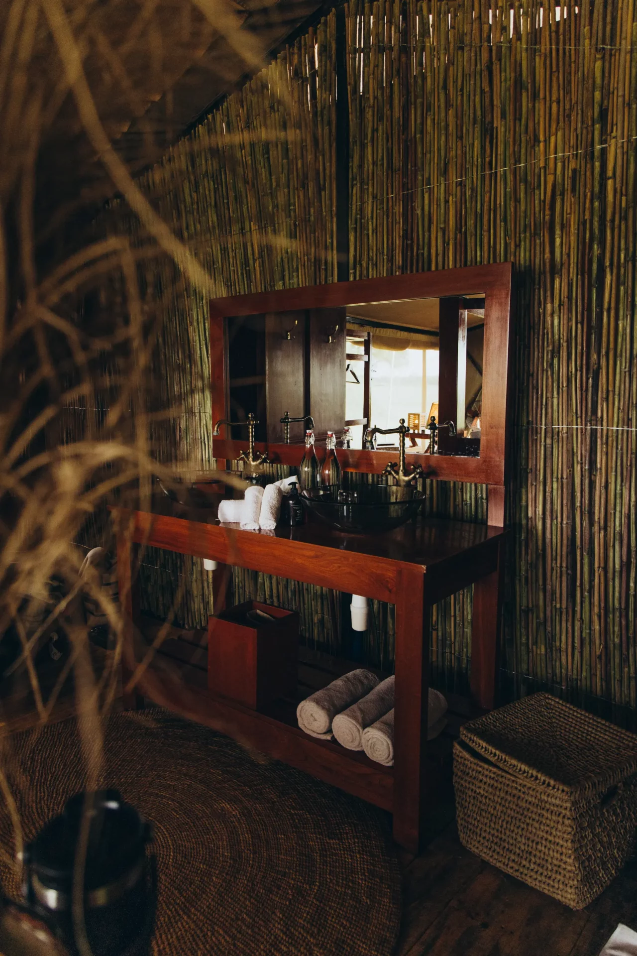 Indulge in refined luxury at Asanja Siri Bustani. Your spacious tented suite boasts a lavish en-suite bathroom, a private veranda perfect for stargazing, and a cozy firepit for evenings reminiscing about the day’s adventures.